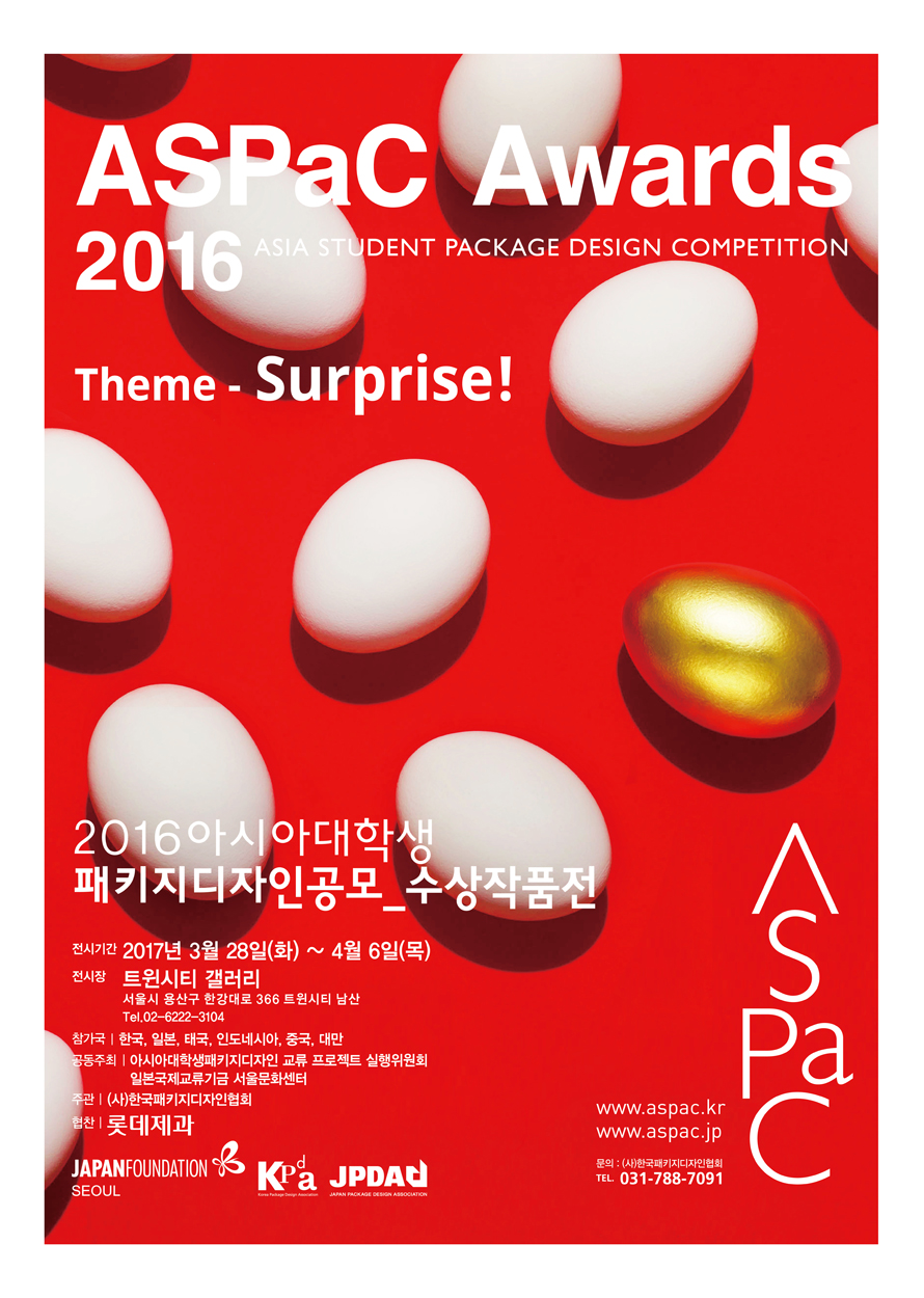 ‘2016아시아대학생패키지디자인 공모전(ASPaC)’은 디자인을 공부하고 있는 한국, 일본, 태국, 인도네시아, 중국(북경), 대만의 아시아 6개국 학생 교류를 통하여, 패키지디자인의 미래를 짊어질 젊은 장인의 힘을 육성하고 앞으로 패키지 디자인에 요구되는 것들을 탐구하고자 마련한 글로벌 프로젝트입니다.