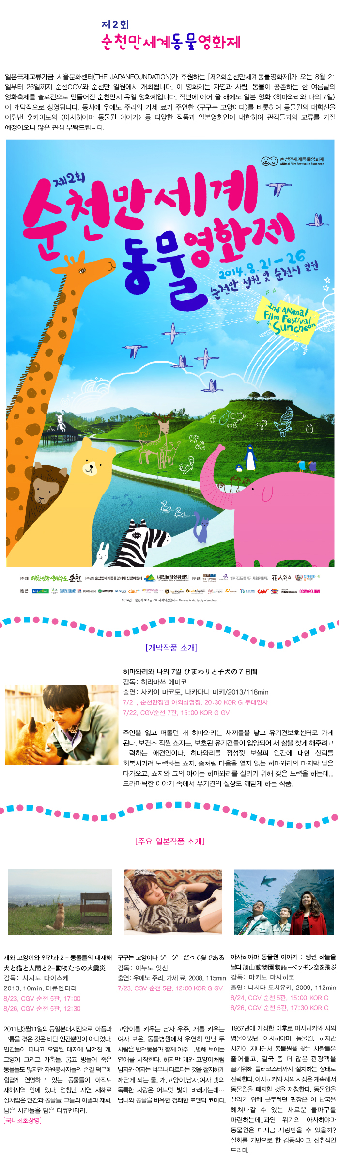 일본국제교류기금 서울문화센터(THE JAPANFOUNDATION)가 후원하는 [제2회순천만세계동물영화제]가 오는 8월 21일부터 26일까지 순천CGV와 순천만 일원에서 개최됩니다. 이 영화제는 자연과 사람, 동물이 공존하는 한 여름날의 영화축제를 슬로건으로 만들어진 순천만시 유일 영화제입니다. 작년에 이어 올 해에도 일본 영화 <히마와리와 나의 7일>이 개막작으로 상영됩니다. 동시에 우에노 주리와 가세 료가 주연한 <구구는 고양이다>를 비롯하여 동물원의 대혁신을 이뤄낸 홋카이도의 <아사히야마 동물원 이야기> 등 다양한 작품과 일본영화인이 내한하여 관객들과의 교류를 가질 예정이오니 많은 관심 부탁드립니다.