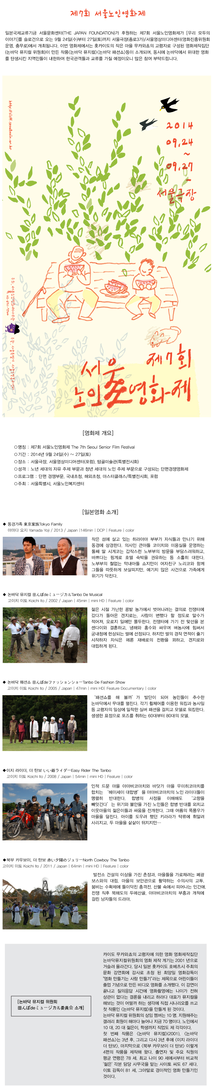 일본국제교류기금 서울문화센터(THE JAPAN FOUNDATION)가 후원하는 제7회 서울노인영화제가 [우리 모두의 이야기]를 슬로건으로 오는 9월 24일(수)부터 27일(토)까지 서울극장(종로3가)/ 서울영상미디어센터(영화진흥위원회 운영, 충무로)에서 개최됩니다. 이번 영화제에서는 홋카이도의 작은 마을 무카와쵸의 고령자로 구성된 영화제작집단(논바닥 뮤지컬 위원회)이 만든 작품<논바닥 뮤지컬><논바닥 패션쇼>등이 소개되며, 동시에 논바닥에서 위대한 영화를 탄생시킨 지역민들이 내한하여 한국관객들과 교류를 가질 예정이오니 많은 참여 부탁드립니다.