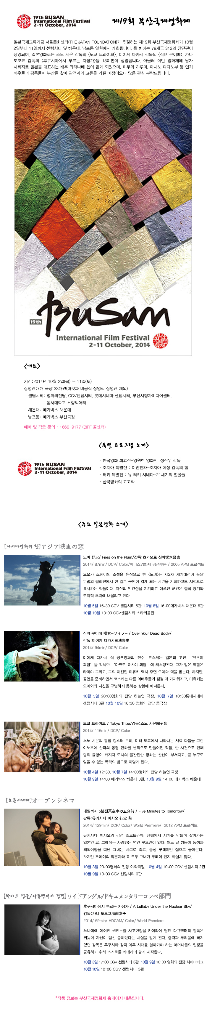 일본국제교류기금 서울문화센터(THE JAPAN FOUNDATION)가 후원하는 제19회 부산국제영화제가 10월 2일부터 11일까지 센텀시티 및 해운대, 남포동 일원에서 개최됩니다. 올 해에는 79개국 312의 장단편이 상영되며, 일본영화로는 소노 시온 감독의 <도쿄 트라이브>, 미이케 다카시 감독의 <식녀 쿠이메>, 가나 도모코 감독의 <후쿠시마에서 부르는 자장가>등 13여편이 상영됩니다. 아울러 이번 영화제에 남자 사회자로 일본을 대표하는 와타나베 겐이 맡게 되었으며, 미우라 하루마, 아사노 다다노부 등 인기 배우들과 감독들이 부산을 찾아 관객과의 교류를 가질 예정이오니 많은 관심 부탁드립니다.