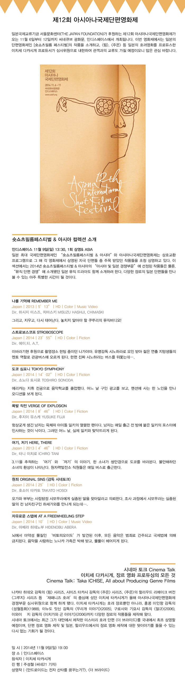 일본국제교류기금 서울문화센터(THE JAPAN FOUNDATION)가 후원하는 제12회 아시아나국제단편영화제가 오는 11월 6일부터 12일까지 씨네큐브 광화문, 인디스페이스에서 개최됩니다. 이번 영화제에서는 일본의 단편영화제인 [숏쇼츠필름 페스티벌]의 작품을 소개하고, <링>, <주온> 등 일본의 호러영화를 프로듀스한 이치세 다카시게 프로듀서가 심사위원으로 내한하여 관객과의 교류로 가질 예정이오니 많은 관심 바랍니다.