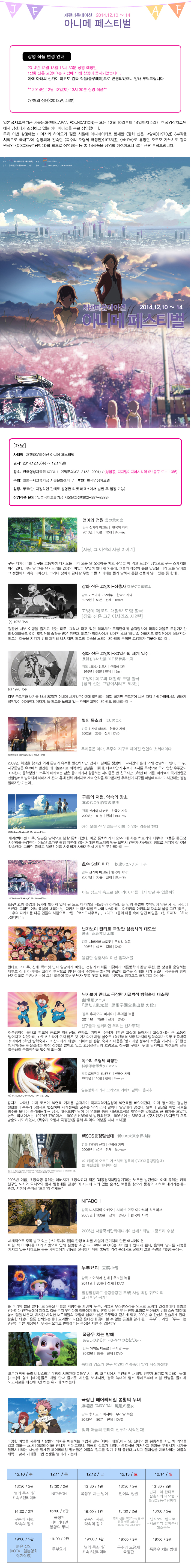 일본국제교류기금 서울문화센터(JAPAN FOUNDATION)는 오는 12월 10일부터 14일까지 5일간 한국영상자료원에서 당센터가 소장하고 있는 애니메이션을 무료 상영합니다.