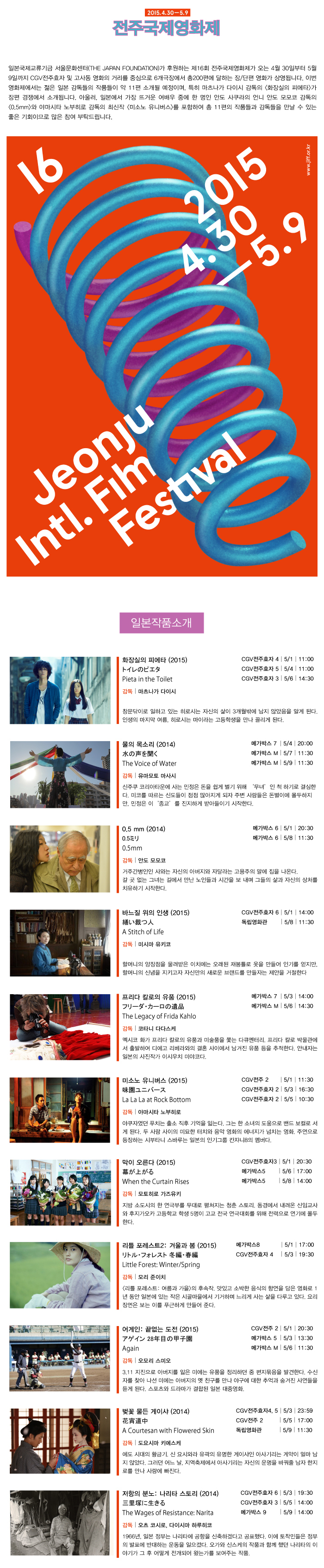일본국제교류기금 서울문화센터(THE JAPAN FOUNDATION)가 후원하는 제16회 전주국제영화제가 오는 4월 30일부터 5월 9일까지 CGV전주효자 및 고사동 영화의 거리를 중심으로 6개극장에서 총200편에 달하는 장/단편 영화가 상영됩니다. 이번 영화제에서는 젊은 일본 감독들의 작품들이 약 11편 소개될 예정이며, 특히 마츠나가 다이시 감독의 <화장실의 피에타>가 장편 경쟁에서 소개됩니다. 아울러, 일본에서 가장 뜨거운 여배우 중에 한 명인 안도 사쿠라의 친언니 안도 모모코 감독의 <0.5mm>와 야마시타 노부히로 감독의 최신작 <미소노 유니버스>를 포함하여 총 11편의 작품들과 감독들을 만날 수 있는 좋은 기회이므로 많은 참여 부탁드립니다.