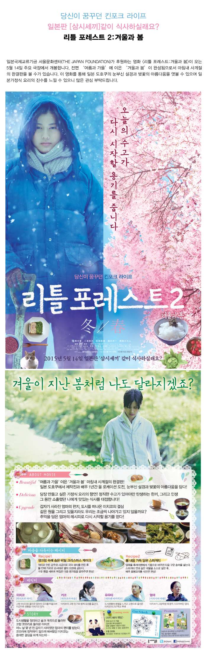 일본국제교류기금 서울문화센터(THE JAPAN FOUNDATION)가 후원하는 영화 <리틀 포레스트2:겨울과 봄>이 오는 5월 14일 주요 극장에서 개봉합니다. 전편 ‘여름과 가을’에 이은 ‘겨울과 봄’이 완성됨으로서 마침내 사계절의 완결판을 볼 수가 있습니다. 이 영화를 통해 일본 도호쿠의 눈부신 설경과 벚꽃의 아름다움을 엿볼 수 있으며 일본가정식 요리의 진수를 느낄 수 있으니 많은 관심 부탁드립니다.