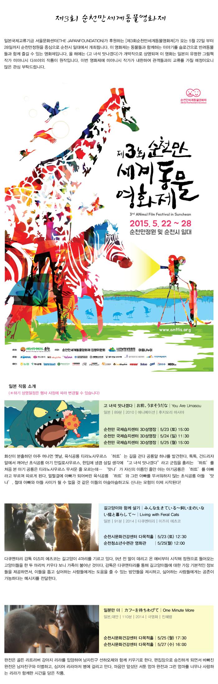 일본국제교류기금 서울문화센터(THE JAPANFOUNDATION)가 후원하는 [제3회순천만세계동물영화제]가 오는 5월 22일부터 28일까지 순천만정원을 중심으로 순천시 일대에서 개최됩니다. 이 영화제는 동물들과 함께하는 이야기를 슬로건으로 반려동물들과 함께 즐길 수 있는 영화제입니다. 작년에 이어 올 해에도 일본 영화 <고 녀석 맛나겠다>가 개막작으로 상영됩니다. 이 영화는 유명한 그림책 작가 미야니시 다쓰야의 작품이 원작으로 이번 영화제에 내한하여 관객들과의 교류를 가질 예정이오니 많은 관심 부탁드립니다.