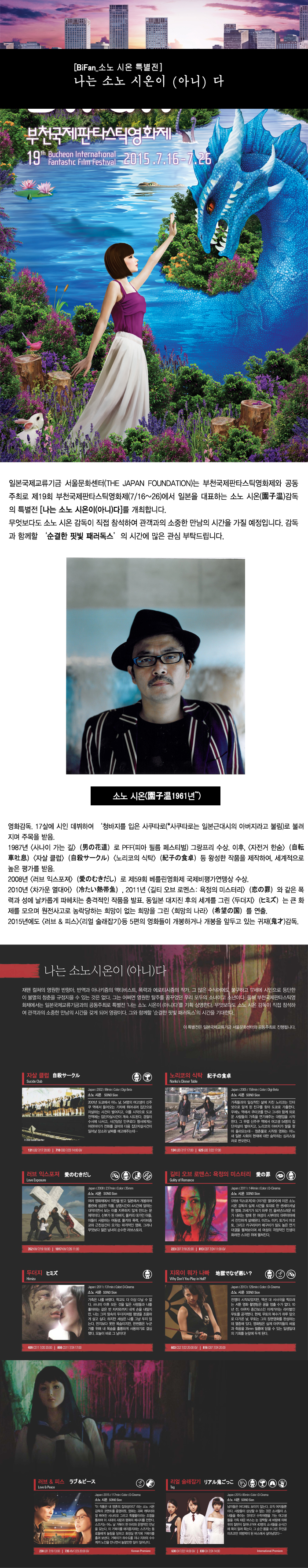 일본국제교류기금 서울문화센터(THE JAPAN FOUNDATION)는 부천국제판타스틱영화제와 공동 주최로 제19회 부천국제판타스틱영화제(7/16~26)에서 일본을 대표하는 소노 시온(園子温) 감독의 특별전 [나는 소노 시온이(아니)다]를 개최합니다.