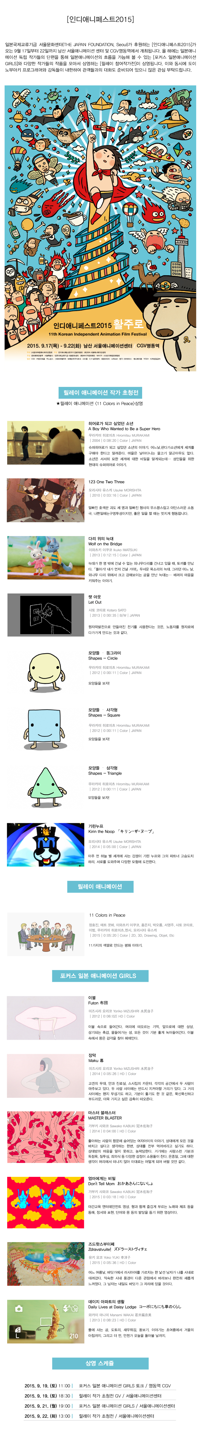 일본국제교류기금 서울문화센터(THE JAPAN FOUNDATION, Seoul)가 후원하는 [인디애니페스트2015]가 오는 9월 17일부터 22일까지 남산 서울애니메이션 센터 및 CGV명동역에서 개최됩니다. 올 해에는 일본애니메이션 독립 작가들의 단편을 통해 일본애니메이션의 흐름을 가늠해 볼 수 있는 [포커스 일본애니메이션GIRLS]와 다양한 작가들의 작품을 모아서 상영하는 [릴레이 참여작가전]이 상영됩니다. 이와 동시에 도이 노부아키 프로그래머와 감독들이 내한하여 관객들과의 대화도 준비되어 있으니 많은 관심 부탁드립니다.