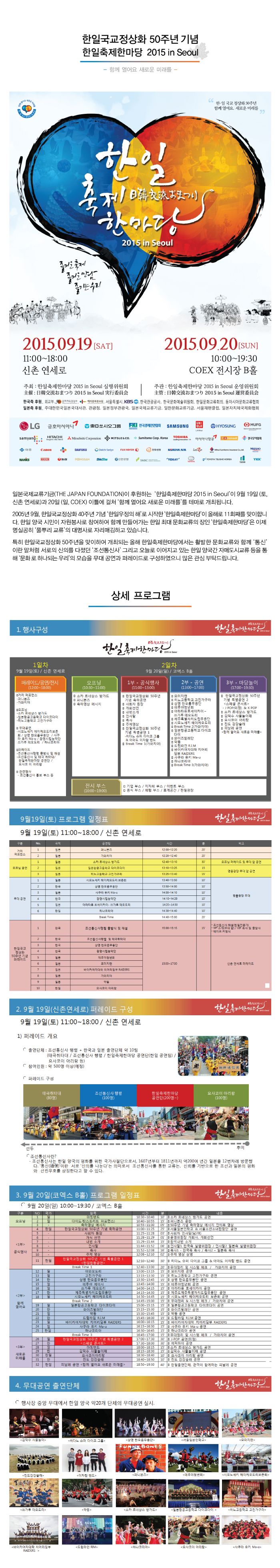 자세한 행사내용은 ‘한일축제한마당 2015 in Seoul’ 공식홈페이지(www.omatsuri.kr)에서 확인할 수 있습니다.일본국제교류기금(THE JAPAN FOUNDATION)이 후원하는 ‘한일축제한마당 2015 in Seoul’이 9월 19일(토, 신촌 연세로)과 20일(일, COEX) 이틀에 걸쳐 ‘함께 열어요 새로운 미래를’를 테마로 개최됩니다. 2005년 9월, 한일국교정상화 40주년 기념 ‘한일우정의 해’로 시작한 ‘한일축제한마당’이 올해로 11회째를 맞이한다. 한일 양국 시민이 자원봉사로 참여하여 함께 만들어가는 한일 최대 문화교류의 장인 ‘한일축제한마당’은 이제 명실공히 ‘풀뿌리 교류’의 대명사로 자리매김하고 있습니다.특히 한일국교정상화 50주년을 맞이하여 개최되는 올해 한일축제한마당에서는 활발한 문화교류와 함께 ‘통신’이란 말처럼 서로의 신의를 다졌던 ‘조선통신사’ 그리고 오늘로 이어지고 있는 한일 양국간 자매도시교류 등을 통해 ‘문화로 하나되는 우리’의 모습을 무대 공연과 퍼레이드로 구성하였으니 많은 관심 부탁드립니다.
