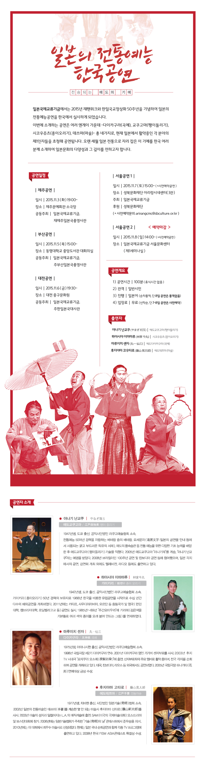 일본국제교류기금에서는 2015년 재팬위크와 한일국교정상화 50주년을 기념하여 일본의 전통예능공연을 한국에서 실시하게 되었습니다이번에 소개하는 공연은 여러 엔게이 가운데 -다이카구라(곡예), 교쿠고마(팽이돌리기), 시코우쥬츠(종이오리기), 데쓰마(마술)- 네가지로, 현재 일본에서 활약중인 각 분야의 제1인자들을 초청해 공연됩니다. 오랜 세월 일본 전통으로 자리 잡은 이 기예를 한국 여러분께 소개하여 일본문화의 다양성과 그 깊이를 전하고자 합니다.
