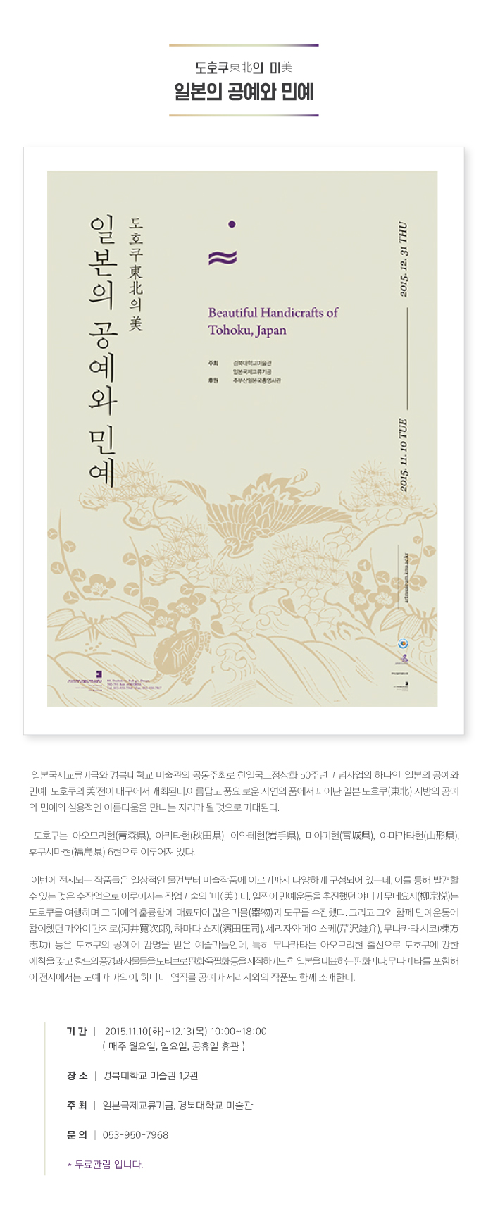 일본국제교류기금과 경북대학교 미술관의 공동주최로 한일국교정상화 50주년 기념사업의 하나인 '일본의 공예와 민예-도호쿠의 美'전이 대구에서 개최된다.아름답고 풍요 로운 자연의 품에서 피어난 일본 도호쿠(東北) 지방의 공예 와 민예의 실용적인 아름다움을 만나는 자리가 될 것으로 기대된다. 도호쿠는 아오모리현(青森県), 아키타현(秋田県), 이와테현(岩手県), 미야기현(宮城県), 야마가타현(山形県), 후쿠시마현(福島県) 6현으로 이루어져 있다.