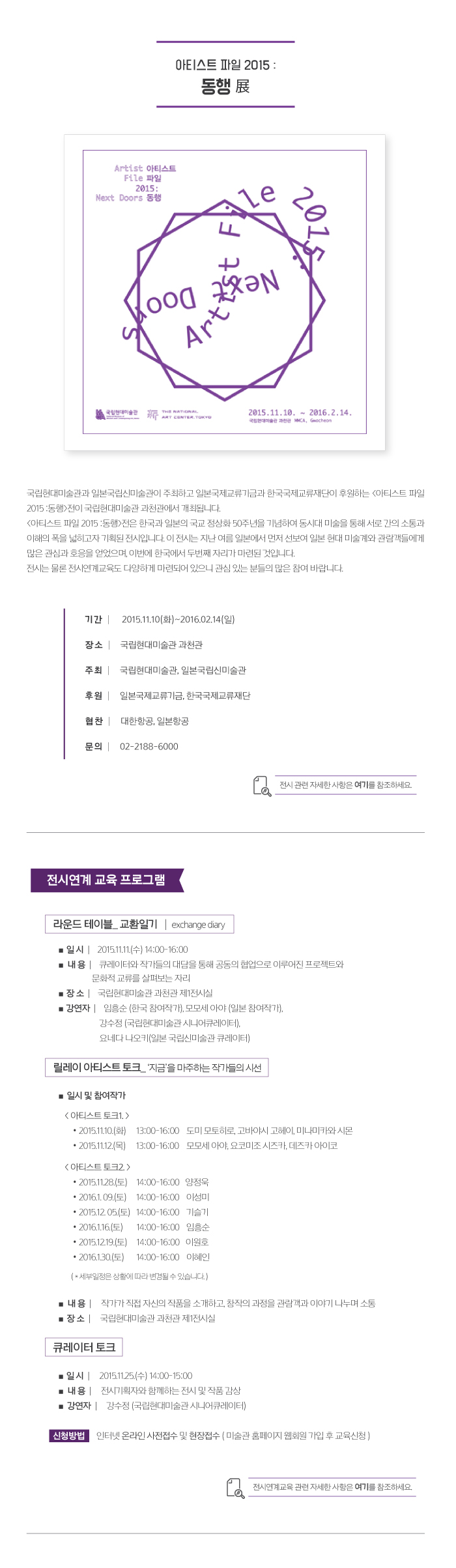 국립현대미술관과 일본국립신미술관이 주최하고 일본국제교류기금과 한국국제교류재단이 후원하는 <아티스트 파일 2015 :동행>전이 국립현대미술관 과천관에서 개최됩니다.