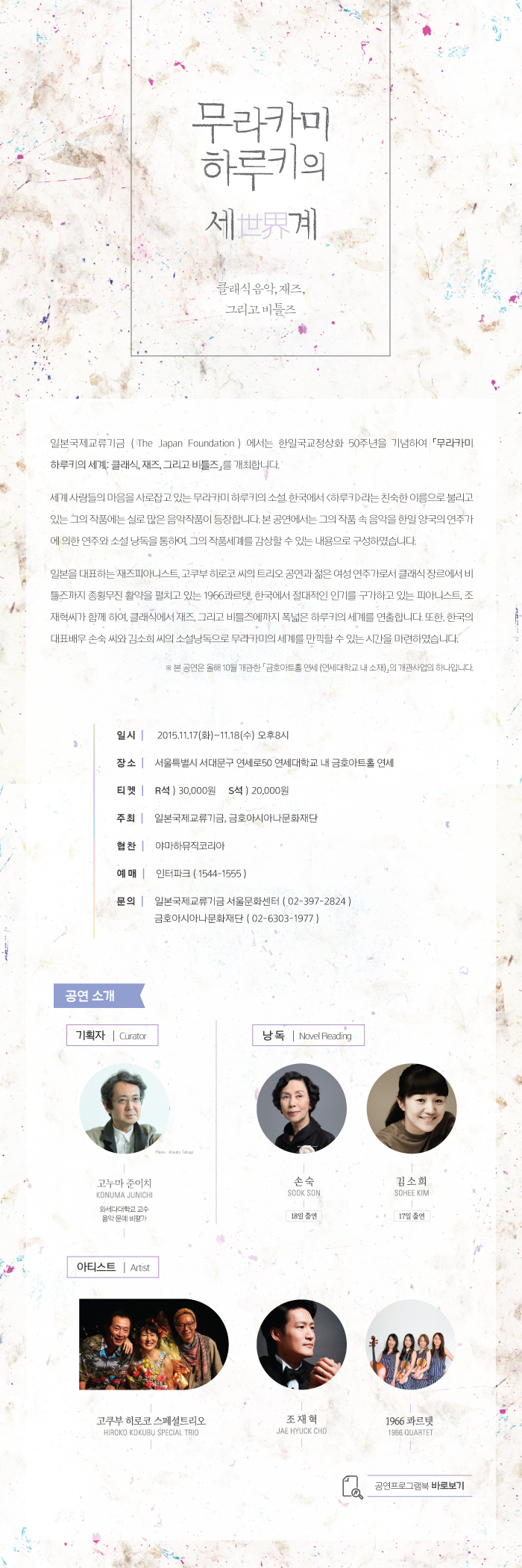 일본을 대표하는 재즈피아니스트, 고쿠부 히로코 씨의 트리오 공연과 젊은 여성 연주가로서 클래식 장르에서 비틀즈까지 종횡무진 활약을 펼치고 있는 1966콰르텟, 한국에서 절대적인 인기를 구가하고 있는 피아니스트, 조재혁 씨가 함께 하여, 클래식에서 재즈, 그리고 비틀즈에까지 폭넓은 하루키의 세계를 연출합니다. 또한, 한국의 대표배우 손숙 씨와 김소희 씨의 소설낭독으로 무라카미의 세계를 만끽할 수 있는 시간을 마련하였습니다.