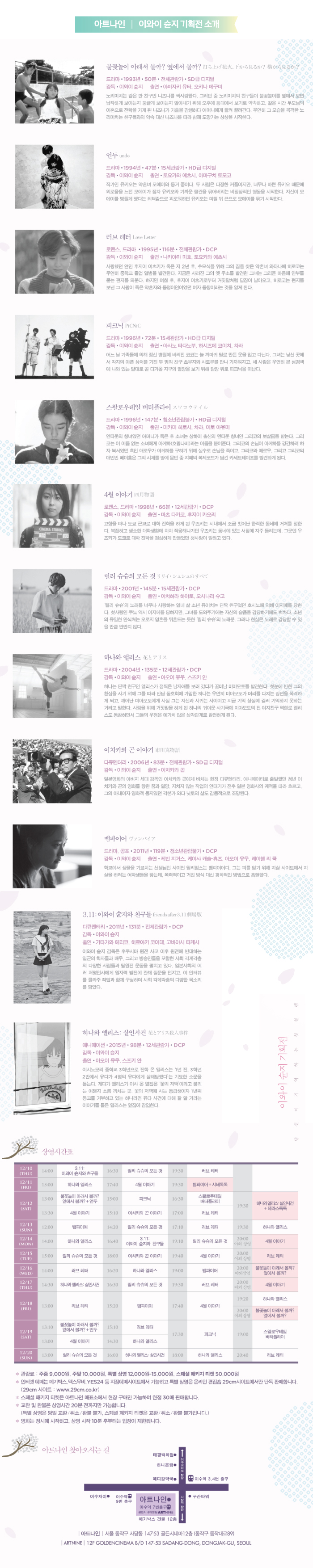 아트나인(이수역)에서는 한일국교정상화 50주년기념 특별섹션으로 일본문화개방과 함께 국내에서 폭발적인 인기를 얻은 <러브 레터>(1999)이후 지금도 꾸준한 인기를 얻고 있는 이와이 슌지 감독의 작품을 집중 상영합니다.