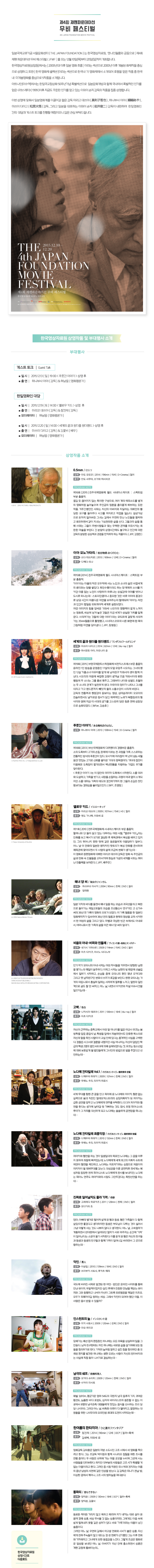 일본국제교류기금 서울문화센터(THE JAPAN FOUNDATION)는 한국영상자료원, 엣나인필름와 공동으로 [제4회 재팬파운데이션 무비 페스티벌/JFMF]를 오는 12월 10일(목)부터 20일(일)까지 개최합니다.