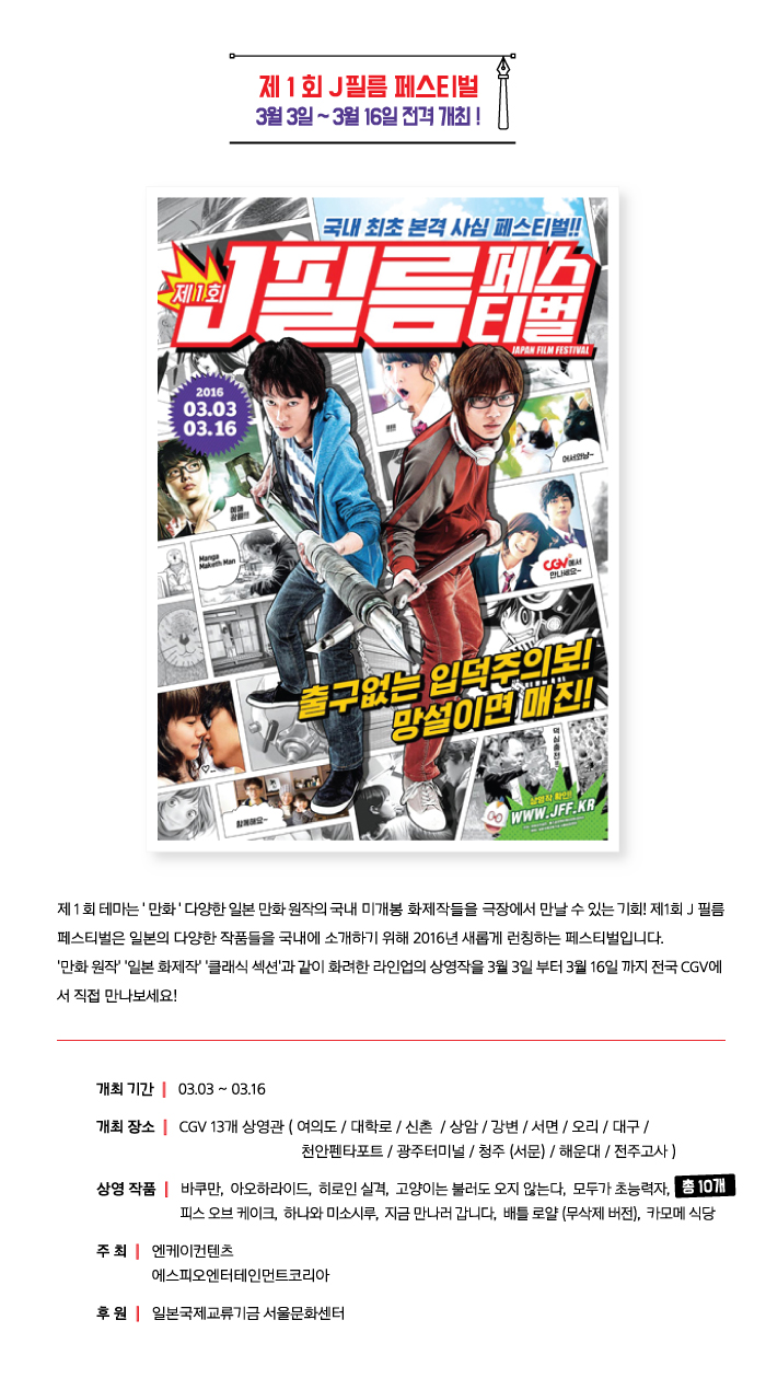 일본 만화 원작의 국내 미개봉 화제작들을 극장에서 만날 수 있는 기회! 제1회 J 필름 페스티벌은 일본의 다양한 작품들을 국내에 소개하기 위해 2016년 새롭게 런칭하는 페스티벌입니다.