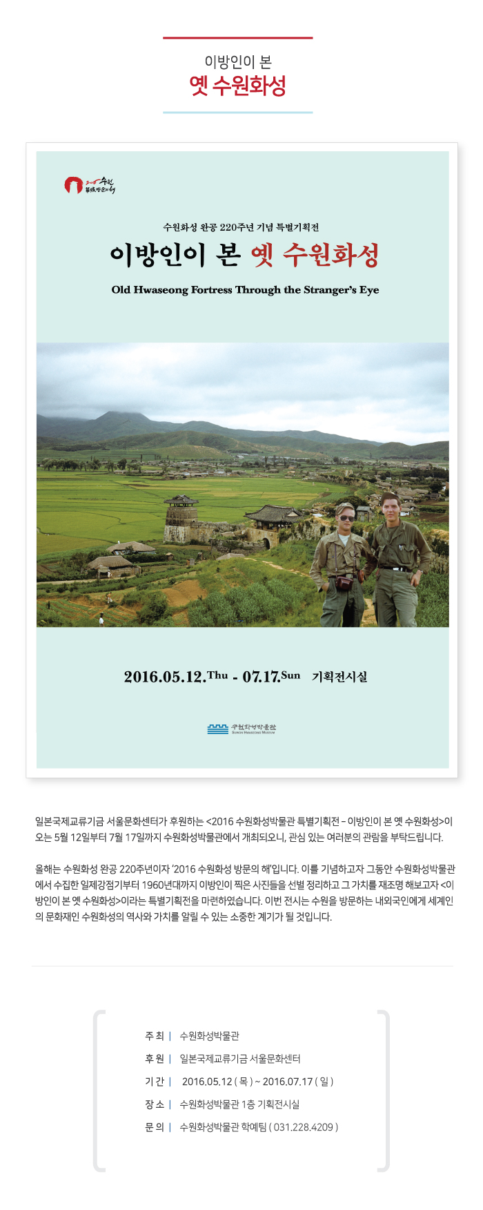 부탁드립니다. 올해는 수원화성 완공 220주년이자 ‘2016 수원화성 방문의 해’입니다. 이를 기념하고자 그동안 수원화성박물관 에서 수집한 일제강점기부터 1960년대까지