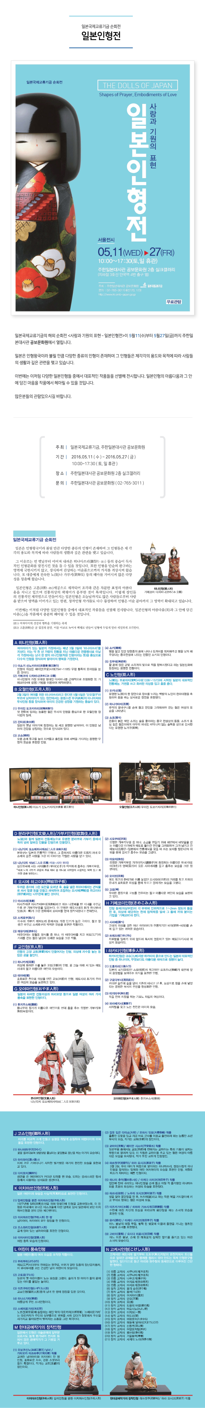 일본국제교류기금의 해외 순회전 <사랑과 기원의 표현 – 일본인형전>이 5월 11일부터 주한일본대사관 공보문화원에서 열립니다. 일본은 인형왕국이라 불릴 만큼 다양한 종류의 인형이 존재하며, 그 인형들은 제 각각 용도와 목적에 따라 사람들의 생활과 깊은 관련을 맺고 있습니다.