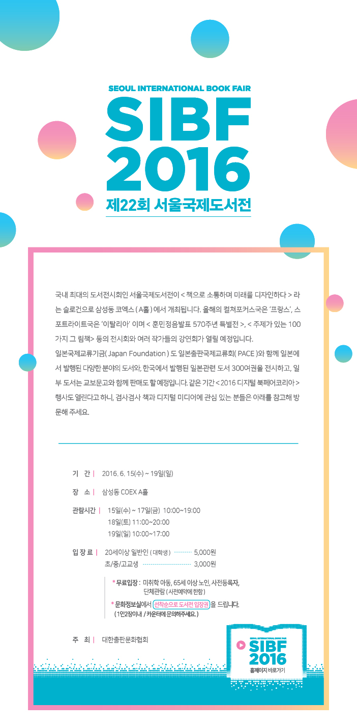 일본국제교류기금(Japan Foundation)도 일본출판국제교류회(PACE)와 함께 일본에서 발행된 다양한 분야의 도서와, 한국에서 발행된 일본관련 도서 300여권을 전시하고, 일부 도서는 교보문고와 함께 판매도 할 예정입니다. 같은 기간 <2016 디지털 북페어코리아> 행사도 열린다고 하니, 겸사겸사 책과 디지털 미디어에 관심 있는 분들은 아래를 참고해 방문해 주세요.