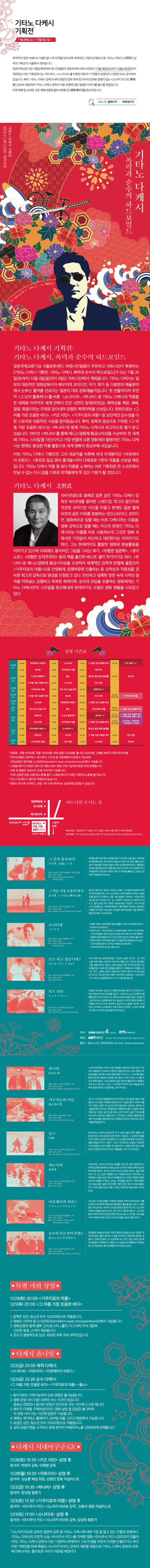 폭력적인 장면 속에서도 아름다운 시적 미학을 담아내며 세계적인 거장의 반열에 오른 기타노 다케시 감독의 기획전이 서울에서 개최됩니다. 일본국제교류기금 서울문화센터와 엣나인필름의 공동주최로 아트나인에서 11월 26일(토)부터 12월 4일(일)까지 개최되는 이번 기획전에서는 [하나비], [소나티네]를 비롯한 대표작 11작품이 상영되며, 다양한 GV도 준비되어 있습니다. 특히, 기타노 다케시 감독의 제작 현장의 밀착 취재 및 다수의 인터뷰 경험이 있는 시노자키 마고토 감독도 방한하여 기타노 다케시 감독의 작품 세계에 대한 생생한 이야기를 들려줄 예정입니다. 티켓 예매 등 상세한 것은 아트나인의 공식 사이트 및 예매 페이지를 참조바랍니다.