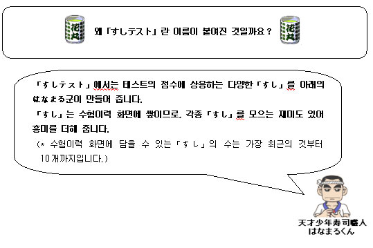 「すしテスト」는 일본국제교류기금이 일본어학습입문단계의 학습자(중/고등학교의 일본어 학습자)를 위하여 개발한 인터넷상의 일본어능력테스트 무료 서비스입니다. 본인이 획득한 점수에 상응하는 스시가 제공되므로 본인의 일본어 능력 확인은 물론 다양한 스시를 모으는 재미도 제공합니다.- すしテスト사이트 바로가기