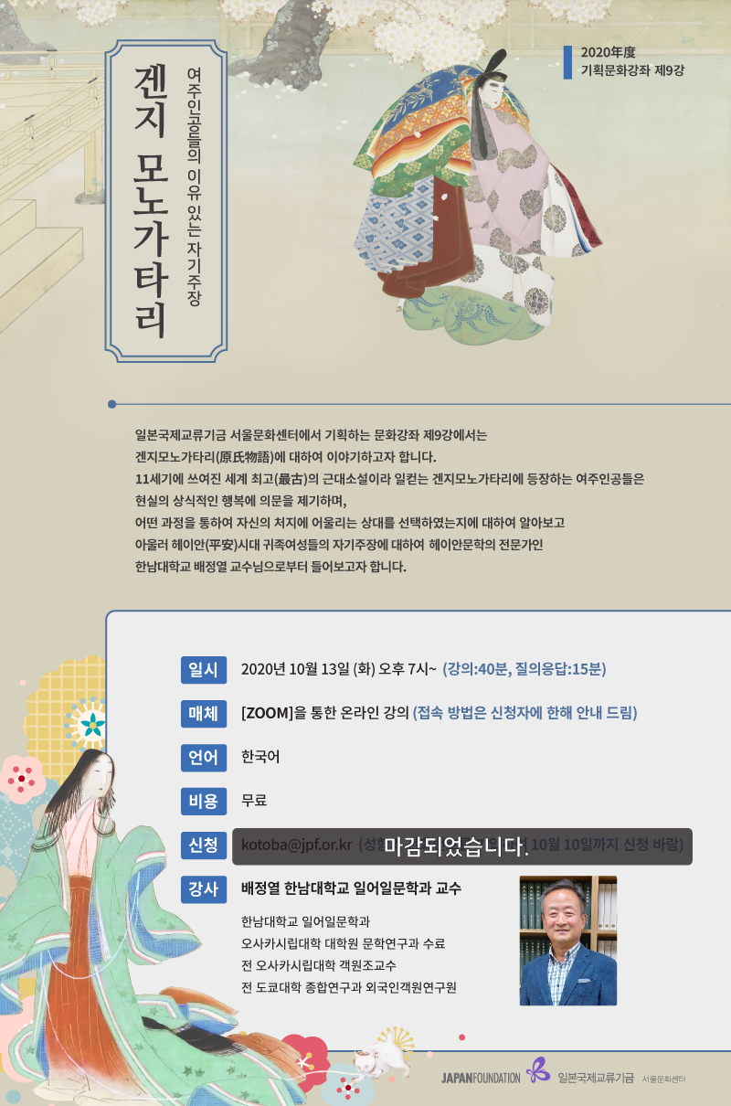 일본국제교류기금 서울문화센터에서 기획하는 문화강좌 제9강에서는 겐지모노가타리(原氏物語)에 대하여 이야기하고자 합니다. 11세기에 쓰여진 세계 최고(最古)의 근대소설이라 일컫는 겐지모노가타리에 등장하는 여주인공들은 현실의 상식적인 행복에 의문을 제기하며, 어떤 과정을 통하여 자신의 처지에 어울리는 상대를 선택하였는지, 아울러 헤이안(平安)시대 귀족여성들의 자기주장에 대하여 헤이안문학의 전문가인 한남대학교 배정열 교수님으로부터 들어보고자 합니다.