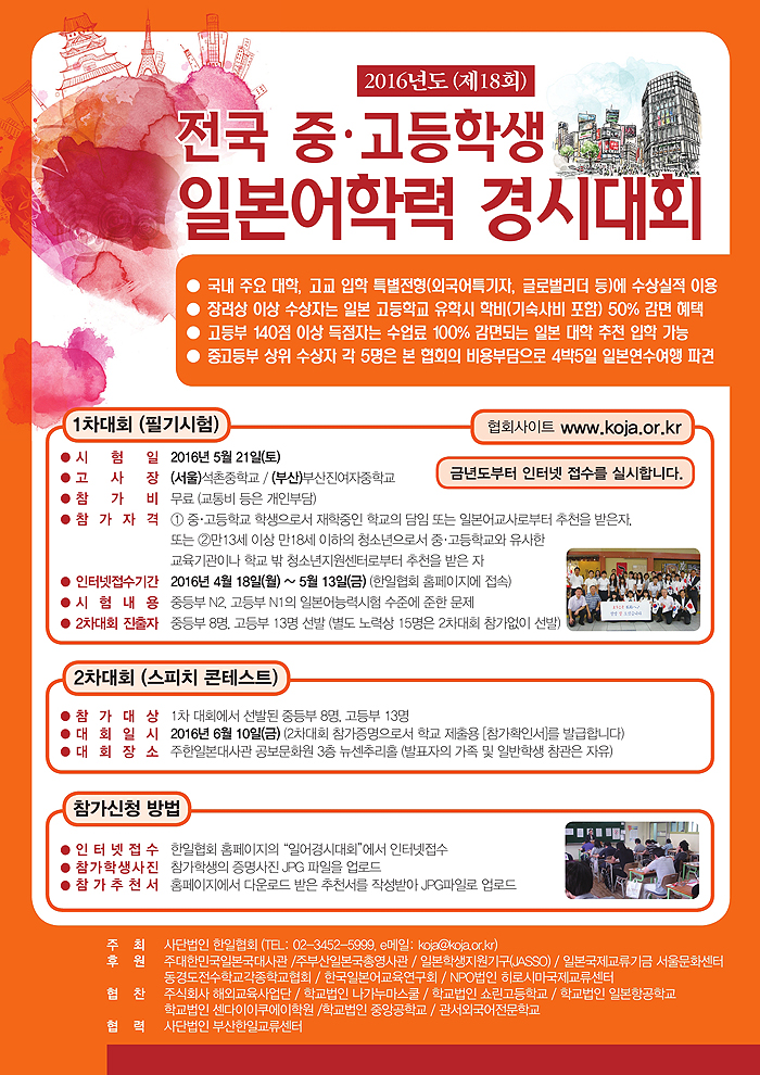 사단법인 한일협회가 주최하는 2016년(제18회) 전국 중고등학생 일본어학력 경시대회의 접수가