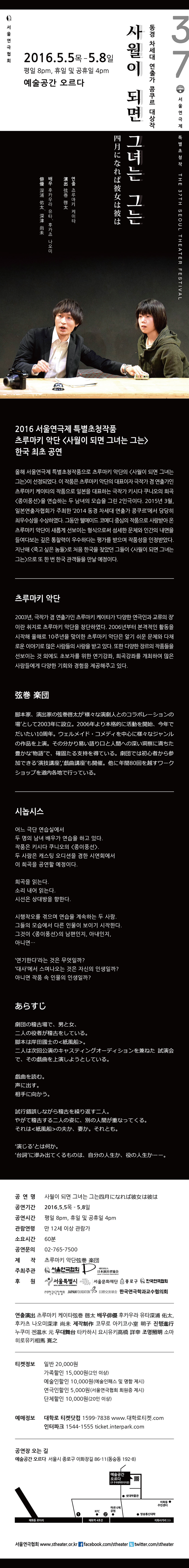 동경 차세대 연출가 콩쿠르 대상작, 츠루마키 악단의 <사월이 되면 그녀는 그는>이 서울연극협회가 주최하는 서울 연극제에 특별 초청되어 2016년 5월 5일부터 8일까지 대학로의 예술공간 오르다에서 공연됩니다. 관심 있는 여러분의 관람을 부탁드립니다.