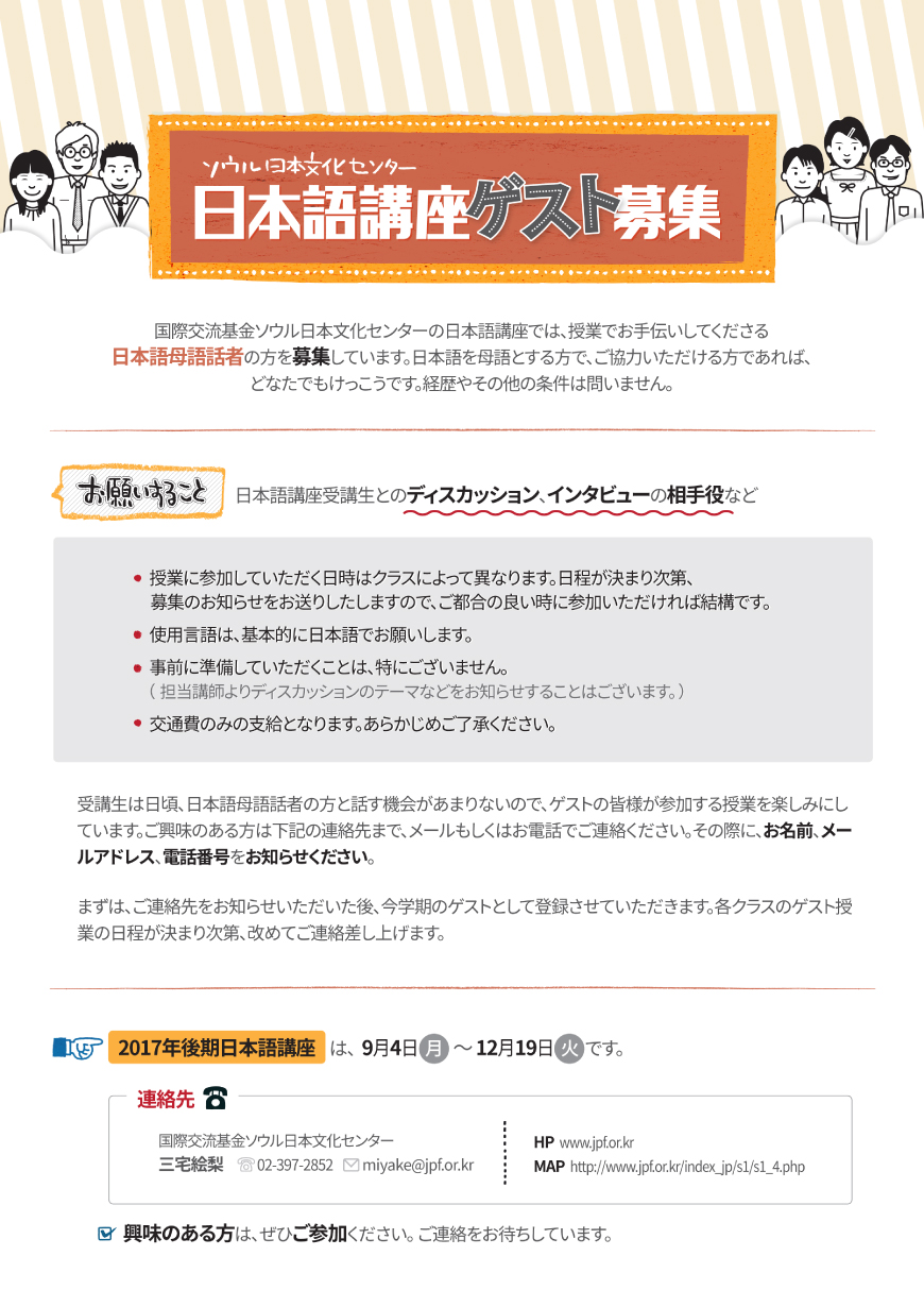国際交流基金ソウル日本文化センターの日本語講座では、授業でお手伝いしてくださる日本語母語話者の方を募集しています。日本語を母語とする方で、ご協力いただける方であれば、どなたでもけっこうです。経歴やその他の条件は問いません。