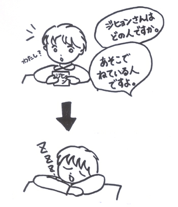 순서) 이름을 넣어서 질문을 한다. 3) 교사는「あそこで、寝ている人ですよ」와 같이「~ている人」의 문형을 사용하여힌트를 준다. 4)「パク・ジヒョン」이란 이름이 적혀 있는 카드를 가지고 있는 학생은 교사의 힌트를 듣고, 들은 내용을 제스처로 표현한다. 이처럼「~ている」의 문장 내용을 잘 들은 후, 들은 동작을 제스처로 보여주면 되는 것이다. 5) 여러 명의 연습이 끝나면 이 번에는 역할을 바꿔 교사가 학생을 지명하여「~さんはどの 人ですか」라고 질문하고 학생은「~ている人ですよ」라고 대답한다.
