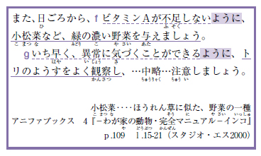 또 평소 비타민A가 부족하지 않도록 소송채 등 짙은 녹색 채소를 줘야 합니다. 일찍 이상증세를 발견할 수 있도록 새의 상태를 잘 관찰하고, …중략… 주의합니다.