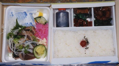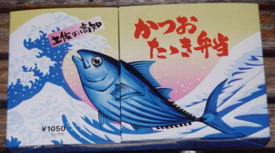 본 회에서 소개하고자 하는「かつおたたき弁当(가츠오타타키벤토)」는 도사의 가츠오 생고기를 사용한 에키벤의 상식을 뒤집는 진품. 파도와 가츠오가 그려진 종이포장 안에 하얀 용기가 두개 놓여 있는데, 한 개는 히노마루 밥*2과 찜 등이 담겨져 있고, 나머지 용기는 구입시 바로 내용물을 넣어 판매하는 것으로, 넉넉하게 양념을 묻힌 꽤 크고 두꺼운 다진 가츠오 6개 정도가 담겨있다. 소스도 따로 2개 들어있어, 도사 요리다운 호쾌함을 느낄 수 있다.