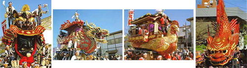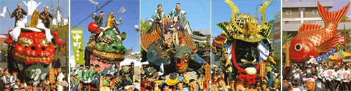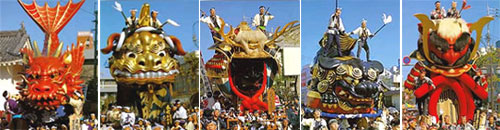 이 14대의 히키야마는 각각 이름이 붙여져 있다. 赤獅子(아카지시), 青獅子(아오지시), と浦島太郎(가메토우라시마타로), 源義経の兜(미나모토노요시츠네노카부토), 鯛(타이), 鳳凰丸(호오마루), 飛龍(히류), 金獅子(긴지시), 武田信玄の兜(다케다신겐노카부토), 上杉謙信の兜(우에스기켄신노카부토), 酒呑童子と源頼光の兜(슈텐도지토미나모토노요리미츠카부토), 珠取獅子(다마토리지시), 鯱(샤치), 七宝丸(싯포마루)이다. 14대 어느것도 모양과 위엄에 뒤지지 않는데, 각각의 히키야마에 얽힌 역사도 깊다. 개최 기간 이외에는 신사 근처에 있는 히키야마 전시장에 전시ㆍ보관된다고 한다.