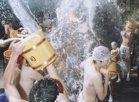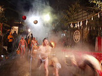 드디어 클라이막스. 끼얹는 와중에 높은 곳에 걸려있던 둥근 박 중 하나가 갈리면서 안에 있던 닭이 튀어 나온다. 어느덧 날은 밝고 마츠리는 끝이 난다.