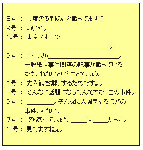 두번째 예는 등장인물의 직업을 추측하게 하는 것이다. 워크시트에 12명의 얼굴을 캡처하여 붙여 놓고, 그 아래에 괄호를 넣는다. 영화를 보면서 직업을 예측하여 그 괄호 안에 써 넣게 한다. 직업명이라면 초급 학습자라도 알 수 있을 것이다. 화면을 잘 보고 그 사람의 복장이나 행동패턴 등으로 추측하게 되는데, 이것은 비디오를 이용한 수업의 효과가 가장 크나 나타나는 연습이라 할 수 있다.