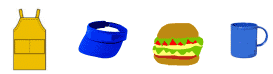 회화 내용에 맞는 소도구: 앞치마, 모자, 햄버거, 컵 등