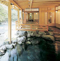 시마(四万)는 4만가지의 질병에 효능이 있다고 하여 붙여진 이름이라고 한다. 시마의 사계는 시마강의 색에 나타난다. 신록의 계절에는 계곡에서 강바닥까지 푸르름에 물들고, 단풍의 계절에는 수면위를 흐르는 붉고 노란 단풍잎이 눈길을 끌며, 겨울에는 그다지 눈이 많이 오는 지방은 아니지만, 백색의 세계로 변한 강변의 아침은 마치 한폭의 수묵화같다. 이런 시마강이 흐르는 바로 옆에 노천탕을 만들어 놓은 여관은 그야말로 눈으로, 귀로, 피부로 대자연을 느낄 수 있는 최적의 장소이다.