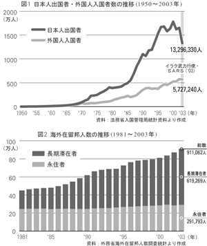 현재 일본에서는, 지금까지 일부 사람들에게만 있었던 국제화 사회, 즉「국제인류시대」를 맞이하고 있다. 2003년 외국으로 나가는 일본인 출국자는 약 1,300만 명, 외국인입국자는 약 600만 명이다(표1). 연간 약 2,000만 명의 사람들이 국경을 넘어서 왕래하고 있는 것이다.
