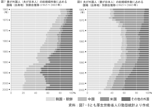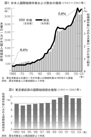 1965년 일본의 국제결혼 비율은 0.4%, 220쌍 중 1쌍이었다. 그러나 1980년대 이후에는 국제결혼이 급증하여 2003년대에는 4.9%, 약 20쌍 중 1쌍 비율로 일본인이 외국인과 결혼하고 있다(표4, 5). 국제결혼 비율이 가장 높은 도쿄의 구에서는 10쌍 중 1쌍이 국제결혼을 하고 있다(표6). 현재는 국제 결혼이 결코 신기한 일이 아니다. 2000년 이후의 연간 일본인의 국제결혼 건수는 35,000명을 넘어섰다. 뿐만 아니라 일본인 남성ㆍ여성의 국제결혼 반려자 상대 국적은 다국적화ㆍ다민족화 되고 있다(표7, 8). 지금까지 국제결혼 건수가 급증한 것은 무슨 이유일까? 그 원인으로 국제결혼 알선이 이루어지고 있는 것을 꼽을 수 있다. 가끔 알선에 의한 위장결혼이 매스컴의 화제가 되는 경우도 있다.