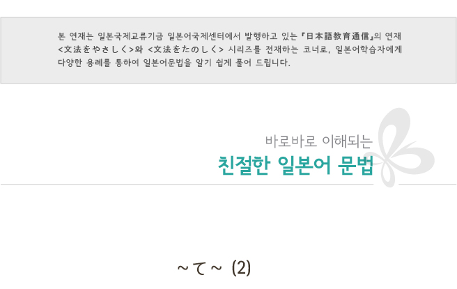 지난 회에서는 ‘~て’의 사용법에 대해 학습했습니다. 이번 회에서도 ‘~て’에 대해 좀 더 자세히 배워보도록