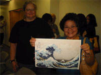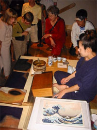 각 현지 기관의 협력을 얻어 에도 후기의 우키요에 화가 가츠시카 호쿠사이의 후가쿠 36경 중「神奈川沖浪裏」를 제재로 강의와 실연을 실시, 학생ㆍ사회인 등 각계각층에서 총 1200여 명에 이르는 사람들이 참가하였습니다. 참가자들은 맨 처음 찍는 묵선에서부터 마지막 색이 들어갈 때까지 1장의 우키요에를 어떠한 공정으로 찍어내는지를 눈앞에서 볼 수 있었습니다. (편집부)