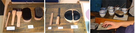 | (左)목판화에 제작에 사용하는 도구. 솔(브러쉬)로 판목에 물감을 스며들게 한다. 왼쪽 3개는 붓 솔, 오른쪽은 솔 (中)왼쪽부터 쿠이키, 켄토우노미, 바렌. 찍을 때에는 바렌에 힘을 주어서 판이 흡입한 물감을 종이에 다시 스며들게 한다 (右)스리시 바로 옆에는 안료 통이나 솔이 놓여져 솜씨 좋게 작업을 해 낸다 |