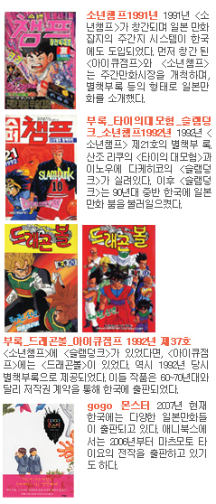 한국에서 일본만화는 낯선 미지의 문화가 아니라 아주 일상적인 엔터테인먼트다. 수 십 년전 한국 만화인 것처럼 국적을 숨기고 출판되었을 때도 있었지만, 지금은 만화의 원산지는 물론 작가와 출판사 등에 대한 정보도 정확히 밝히고 있다. 90년대 중반 이후 한국에 일본의 잡지 시스템이 도입된 이후 잡지연재와 책 출간으로 이어지는 만화 출판 사이클도 동일하다. 더 나아가 서구만화와 달리 흑백에 장편 시리즈로 연재되는 근본적인 만화문법도 동일하다. (다만, 재책방법의 차이로 인해 일본만화는 우에서 좌로, 한국만화는 좌에서 우로 읽는다.) 일본만화는 2007년 현재 한국에서 가장 친근하고 일상적인 엔터테인먼트 중 하나인 것이다. 그런데, 90년대 후반 등장한 몰아보기시장(대여시장), 온라인 만화시장, 어린이용 기획만화시장과 같은 한국만화시장의 지형 변화는 일본만화를 수용하는 한국적 방식을 정착시켰다.