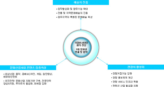 아시아문화중심도시 조성사업은 광주 지역의 유무형의 문화 자원을 활용하여 예술진흥 및 문화관광산업의 육성을 주요 과제로 두고 있다. 이를 위해 판소리 등 전통예술로부터 광주비엔날레 등 광주지역의 예술역량을 강화하고 문화・관광산업에 대한 지원을 확대한다. 또한 문화콘텐츠 분야 중 성장 가능성이 큰 음악, 공예・디자인, 게임, 첨단영상, 에듀테인먼트를 5대 콘텐츠 산업으로 설정하여 집중 육성하며, 아시아문화중심도시와 서남해안 복합관광레저도시를 연계, 관광객을 유치하는 광주・전남 지역의 관광활성화를 도모하고, 이를 위한 관광기반시설 확충 및 홍보역량을 강화하기 위한 노력을 하고 있다.