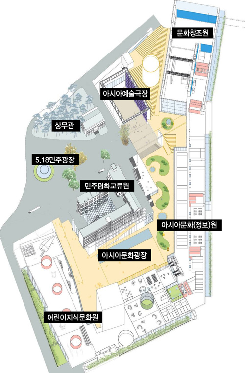 국립아시아문화전당은 국제건축설계경기를 거쳐 건축가 우규승씨의 <빛의 숲>을 당선작으로 확정했다. <빛의 숲>은 21세기 최첨단 복합문화시설로서 새로운 시설물을 기존 지표면보다 낮게 배치하여 5·18민주화운동과 관련한 역사적 건물을 기념비화 하고, 지상의 시민공원과 소통하는 새로운 개념의 공간으로 구성된다.
