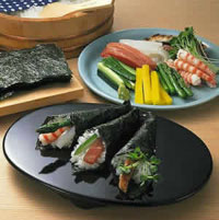 우선「테마키스시(手巻き寿司)」. 손 크기의 김 위에 소량의 초밥을 평평하게 얹어 그 위에 생선회나 알, 오이, 자소, 계란부침 등을 각각 감아 먹는 스시다.「네타(ネタ)」라고 부르는 생선회 등의 "소"는 많이 넣으면 좋지 않다. 많아야 3종류 정도만 함께 넣어 감는다. 예를 들면 시소(일본깻잎), 오이, 참치 이 정도다. 한국요리는, 예를 들면 비빔밥과 같이 맛이 섞임으로써 더욱 맛이 깊어지는 요리가 많지만, 스시는 생선회의 신선함이나 회 자체의 맛을 즐기는 요리이다. 욕심을 부려 참치에 도미에 이크라(참치알) 등등 여러가지를 감아 먹으면 보기에도 안 좋고 맛도 없어진다.