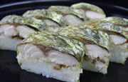 마지막으로 소개하는 스시는「오시즈시(押し寿司)」이다. 밥과 소를 겹쳐서 일정시간 눌러 만든다. 가장 유명한 것은 고등어로 만드는 오시즈시다. 오시즈시에 사용되는 물고기는 대체로 고등어나 송어, 청어와 같은 등푸른생선이 많은 것이 특징이다. 어린 대나무 잎 등으로 감은 후 수시간부터 하룻밤동안 눌러 만드는 오시즈시도 있다. 오시즈시를 만드는 전용기도 판매되고 있어 일반 가정에서도 만들어 먹을 수는 있지만, 기차역 등에서 손쉽게 먹을 수 있는 도시락 쪽이 많은 스시이다. 이것도 지방에 따라 여러가지 종류가 있어 다양하게 즐길 수 있다.