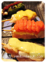 그럼 야키토리의 메뉴를 알아보도록 하자. 각종 부위만을 4~5조각씩 꽂아 특제 간장 소스를 발라가면서 굽거나 소금을 뿌려 구운 것, 살코기를 갈아 동그랗게 빚은 것, 명태알이나 치즈, 와사비, 마요네즈 등을 토핑으로 얹은 것, 은행이나 고기 크기로 썰은 대파, 버섯 등을 사이 사이에 끼운 것, 계란 노른자를 더해 금가루를 뿌린 화려한 야키토리도 있다. 이쯤 되면 단순한 안주에서 벗어나 하나의 요리로 평가해 줄 수 있지 않을까?