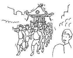 今年も町(ちょう)内(ない)の老(ろう)若(にゃく)男(なん)女(にょ)がこぞって祭りに参加しました。
