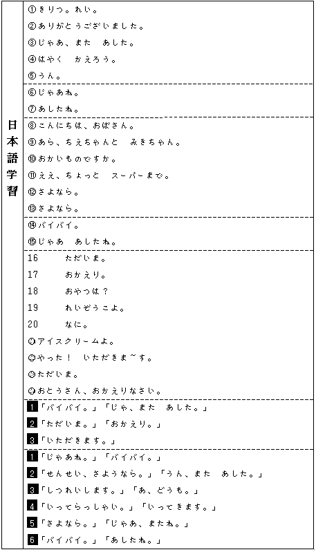 활동순서 ① 교사는「1.おはよう」「2.さようなら」에서 학습한 인사표현을 전부 말한다. ② 학생은 교사가 말한 인사표현을 듣고 공책에 적는다. ③ 학생들이 알아 들은 인사표현을 말하게 한다. ④ 교사는 그것을 판서한다. ⑤ 틀린 경우에는 다 같이 수정한다. ⑥ 다른 학생이 말하지 않은 인사표현을 마지막까지 말한 학생이 승리한다. |