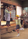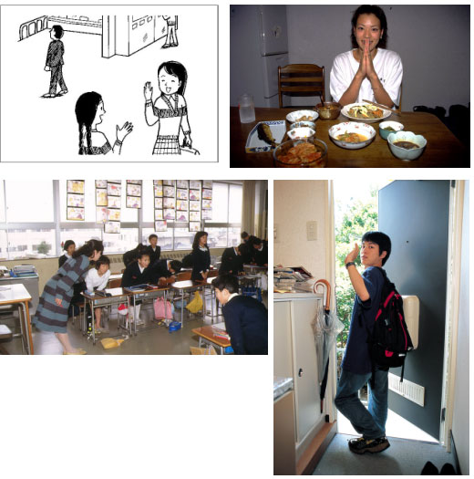 활동순서 ① 그룹에 인사장면의 사진 및 일러스트를 2명에게 1장씩 나눠준다.(4명이면2장) ② 그 사진과 일러스트를 보고 어떤 인사를 하고 있는지 상상하면서 연습한다(답이 하나가 아닌 것도 있다). ④ 그룹 속의 또 다른 2명이 갖고 있는 사진, 일러스트와 교환한다. ⑤ 연습이 끝나면, 사진과 일러스트를 회수한다. ⑥ 클래스 전원은 회수한 사진과 일러스트를 보면서 인사 표현을 확인한다. |